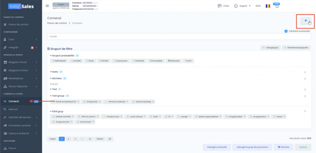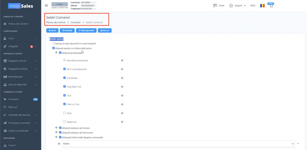 Interfață flexibilă – poți ascunde sau afișa în meniul “editare comanda” doar secțiunile dorite (istoric acțiuni comanda sau note interne), pentru o vizualizare clară și rapidă.
