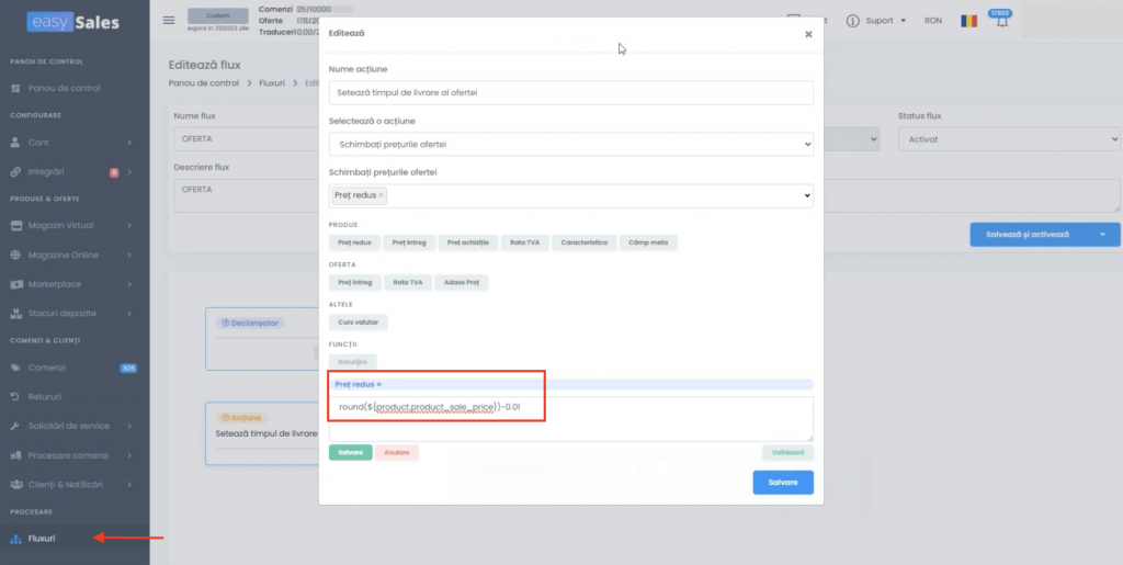 Observații pentru livrare (AWB) – în fluxuri este disponibil un nou câmp, care permite adăugarea automată de informații utile pentru curier: ID-ul comenzii, platforma de proveniență, coduri de produs sau instrucțiuni speciale.